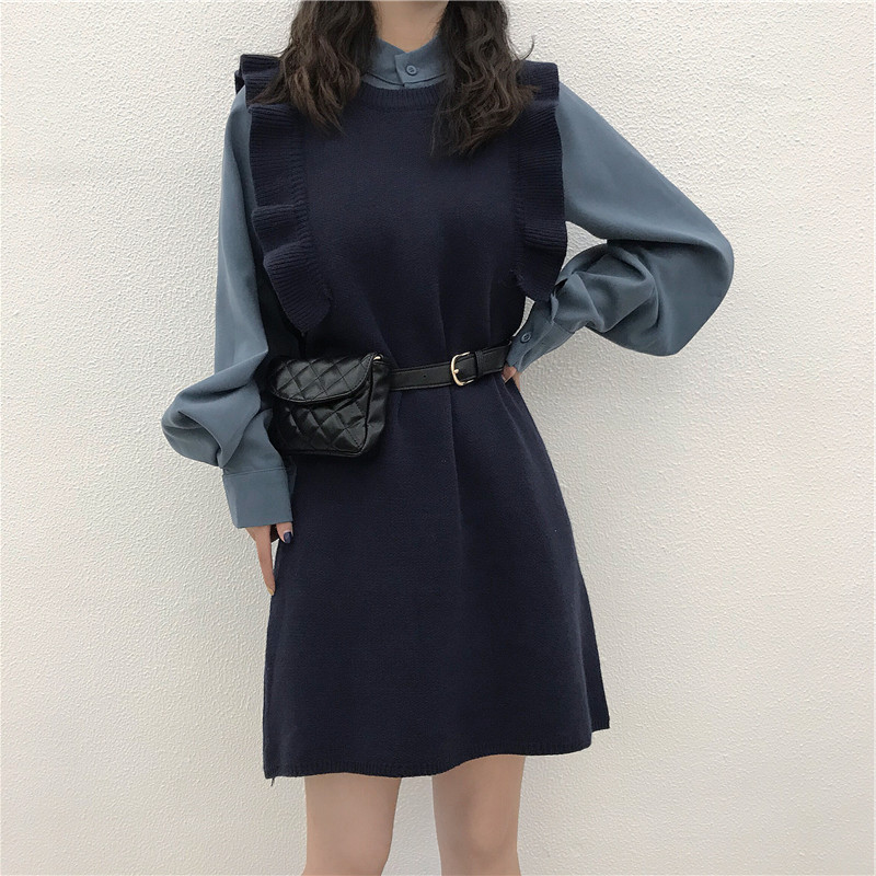 二点セットスウィート韓国系レトロ気質よい無地シャツ スタイリッシュフリル飾りニットベストワンピースセットアップ